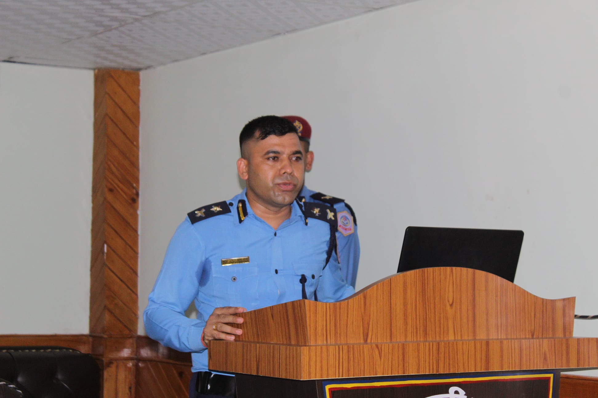 कार्यक्रममा जिल्ला प्रहरी कार्यलयका प्रमुख प्रहरी नायब उपरीक्षक अम्बर बहादुर थापा क्षेत्रीले जिल्ला प्रहरी कार्यलयले गरेका कामको सम्पादन प्रस्तुतीकरण गर्नु भएको थियो उहाँले जिल्ला प्रहरी कार्यलय अर्घाखाँचीले डिसिसिएमसि को बैठकले गरेका निर्णय हरु कार्यन्यन गरेको ,प्रत्येक पालिका मा गुनासो पेटिका राखिएको ,जिल्लामा ३०५ जना जनशक्ति रहेको मा ७५% लाई दैनिक जनसेवामा परिचालन गरिएको ,जुवातास तथा सामाजिक बिचलन ल्याउने लाई कार्बाही तथा अनुसन्धानमा राखिएको ,४ ठाउँमा नियमित चेकपन्ट राख्नुका साथै अहिले जिल्लाको ३५ वटा स्थानमा चिकिङ गरिरहेको , चोरी तथा सामाजिक खलबल मच्चाउन खोज्ने हरु लाई कानुनी दायरा ल्याइएको यस्को निम्ति २४ सै घन्टा प्रहरी परिचालन गरिएको बिपत्ति जन्य घटना मा प्रहरीले फन्ड लाइनमा काम गरेको कोबिड -१९ लगायत का महामारीको बेलामा प्रहरी अग्रदस्तामा खटिएको , अबैध घरेलु मदिरा उत्पादन मा रोक लगाइएको ,लागु औंषध तथा दुर्बसनी सम्बन्धमा कठोर निर्णय गरिएको ,अनुशीक्षण तालिम संचालन गरिएको ,आत्महत्या तथा बालबिबाह मा कमि ल्याइएको प्रहरीले  जहिले पनि मुस्कान सहितको सेवा प्रदान गरिएको उल्लेख गर्नु भएको थियो ।