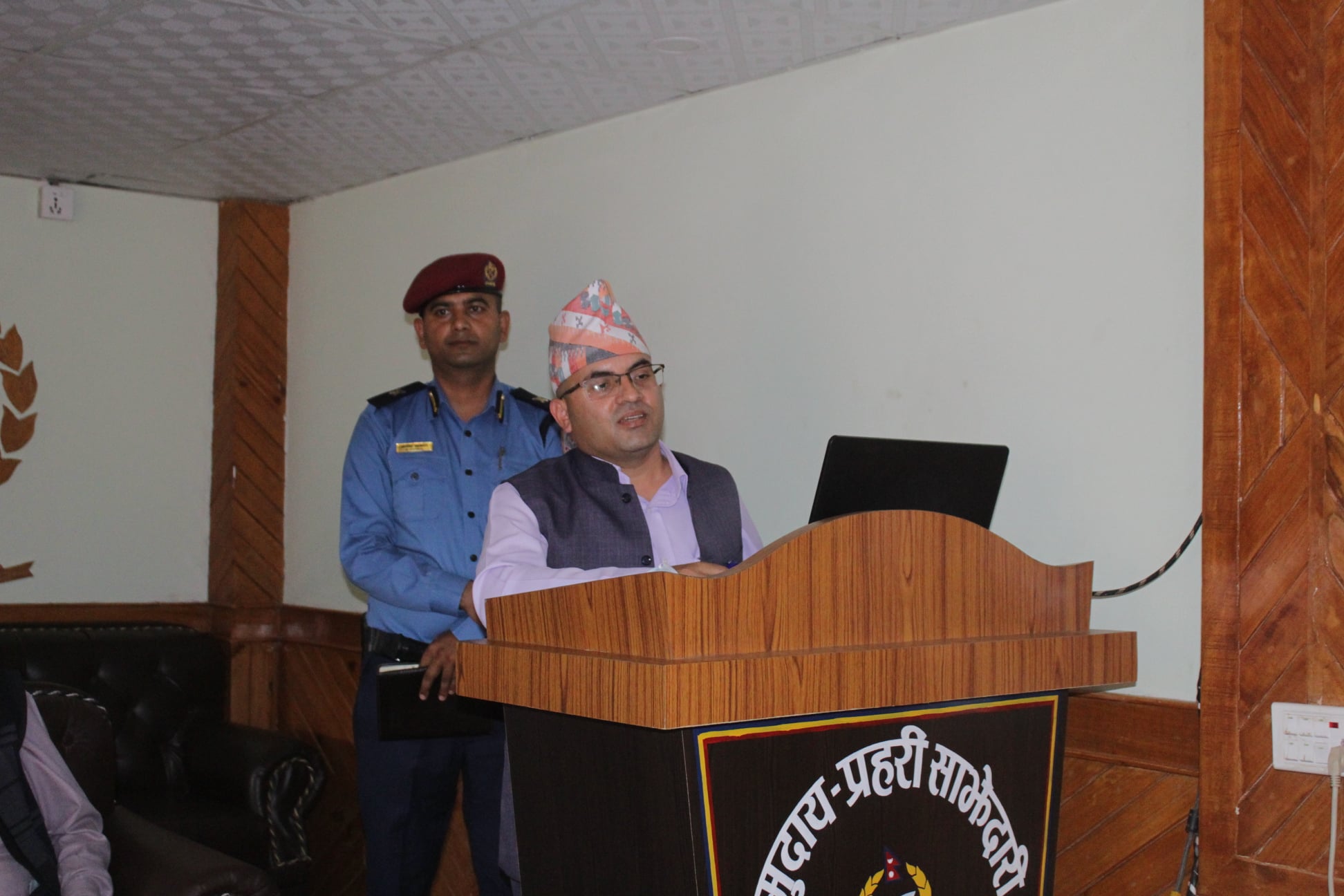 कार्यक्रममा जिल्ला प्रहरी कार्यलयका प्रमुख प्रहरी नायब उपरीक्षक अम्बर बहादुर थापा क्षेत्रीले जिल्ला प्रहरी कार्यलयले गरेका कामको सम्पादन प्रस्तुतीकरण गर्नु भएको थियो उहाँले जिल्ला प्रहरी कार्यलय अर्घाखाँचीले डिसिसिएमसि को बैठकले गरेका निर्णय हरु कार्यन्यन गरेको ,प्रत्येक पालिका मा गुनासो पेटिका राखिएको ,जिल्लामा ३०५ जना जनशक्ति रहेको मा ७५% लाई दैनिक जनसेवामा परिचालन गरिएको ,जुवातास तथा सामाजिक बिचलन ल्याउने लाई कार्बाही तथा अनुसन्धानमा राखिएको ,४ ठाउँमा नियमित चेकपन्ट राख्नुका साथै अहिले जिल्लाको ३५ वटा स्थानमा चिकिङ गरिरहेको , चोरी तथा सामाजिक खलबल मच्चाउन खोज्ने हरु लाई कानुनी दायरा ल्याइएको यस्को निम्ति २४ सै घन्टा प्रहरी परिचालन गरिएको बिपत्ति जन्य घटना मा प्रहरीले फन्ड लाइनमा काम गरेको कोबिड -१९ लगायत का महामारीको बेलामा प्रहरी अग्रदस्तामा खटिएको , अबैध घरेलु मदिरा उत्पादन मा रोक लगाइएको ,लागु औंषध तथा दुर्बसनी सम्बन्धमा कठोर निर्णय गरिएको ,अनुशीक्षण तालिम संचालन गरिएको ,आत्महत्या तथा बालबिबाह मा कमि ल्याइएको प्रहरीले  जहिले पनि मुस्कान सहितको सेवा प्रदान गरिएको उल्लेख गर्नु भएको थियो ।