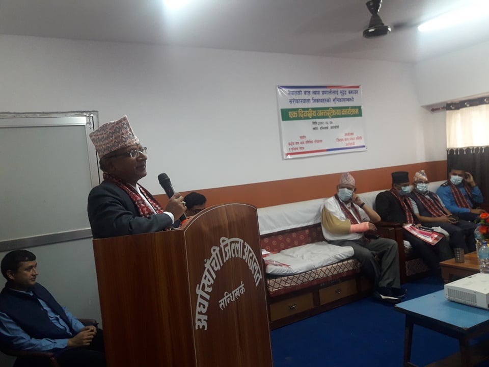 बिहीबार जिल्ला अदालत परिसर सन्धिखर्कमा आयोजित कार्यक्रममा उच्च अदालत लुम्बिनीका मुख्य न्यायाधिस शिबराज सुबेदीले बालबालिकाहरु घरपरिवारबाटै असुरक्षित हुँने बताए । आमा बुवाले दोस्रो विवाह गर्दा बालबालिका असुरक्षित हुँने न्यायाधिश सुवेदीको भनाई थियो । न्यायाधिश सुवेदीले बालबालिकाहरुले गल्ती गर्ने तर अपराध नगर्ने भन्दै बालबालिका सम्बन्धि महासन्धिको ऐनमा नेपालले समेत हस्ताक्षर गरिसकेको जानकारी दिए । उनले बालबालिकाहरुलाई असल नागरिक बनाउने कि अपराधी आजको मुख्य चुनौती भएको बताए । उनले जिल्लामा बाल सुधार गृहको आवश्यकता औल्याउँदै कानुनले अबलम्बन गरेको बाल सुधार केन्द्र निमार्ण गर्न जोड दिए ।