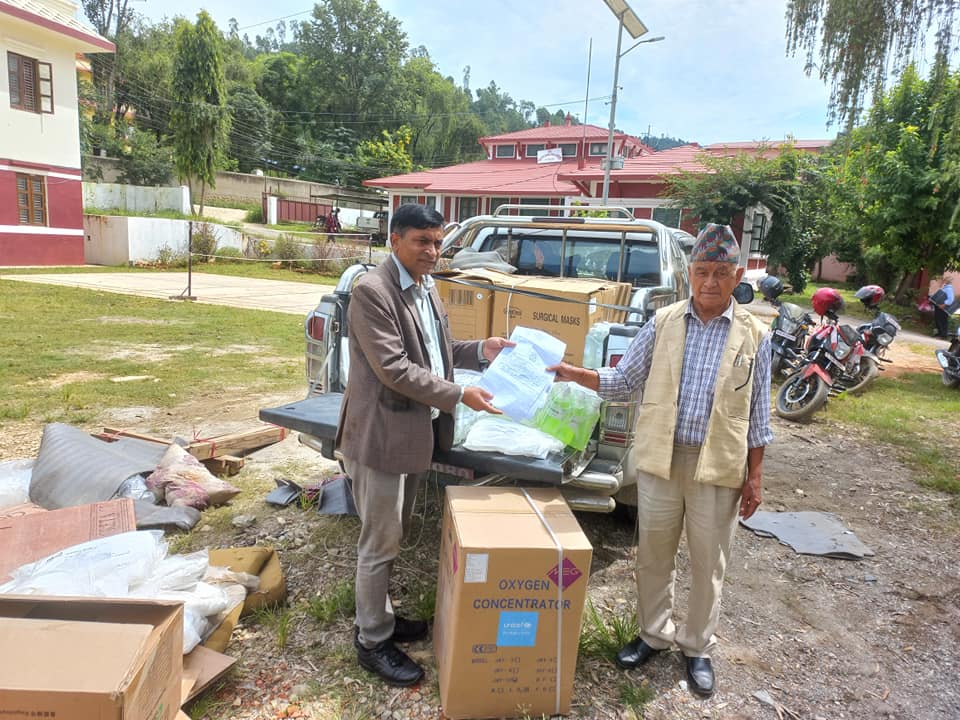 प्रवासी नेपालीहरुकाे सहयोगमा ६ थान कन्सल्ट्रेटर मेसिन, १० वटा अक्सिजन सिलिन्डर , २४ थान थर्माेमिटर , ५५० थान पिपिई सेट, र सर्जिकल माक्स ७ हजार थान र ७५ लिटर स्यानीटाजर कांग्रेस नेता पाण्डेले जिल्ला समन्वय समिति प्रमुख पिताम्वर शर्मालाई हस्तान्तरण गर्नु भएको हाे ।