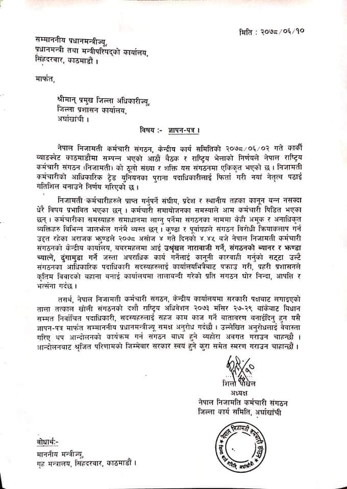 सन्धिखर्क, अर्घाखाँची (अर्घाखाँचीडट्कम) । नेपाल निजामती कर्मचारी संगठन अर्घाखाँचीले जिल्ला प्रशासन मार्फत प्रधानमन्त्रीलाई ज्ञापन पत्र बुझाएकाे छ ।