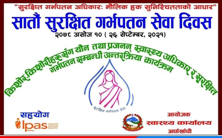 सन्धिखर्क, अर्घाखाँची (अर्घाखाँचीडट्कम) । अर्घाखाँची जिल्लाको सदरमुकाम सन्धिखर्कमा सुरक्षित गर्भपतन अधिकारः मौलिक हक सुनिश्तिताको आधार भन्ने मुल नारा साथ सातौ सुरक्षित गर्भपतन सेवा दिवस मनाइएको छ ।
