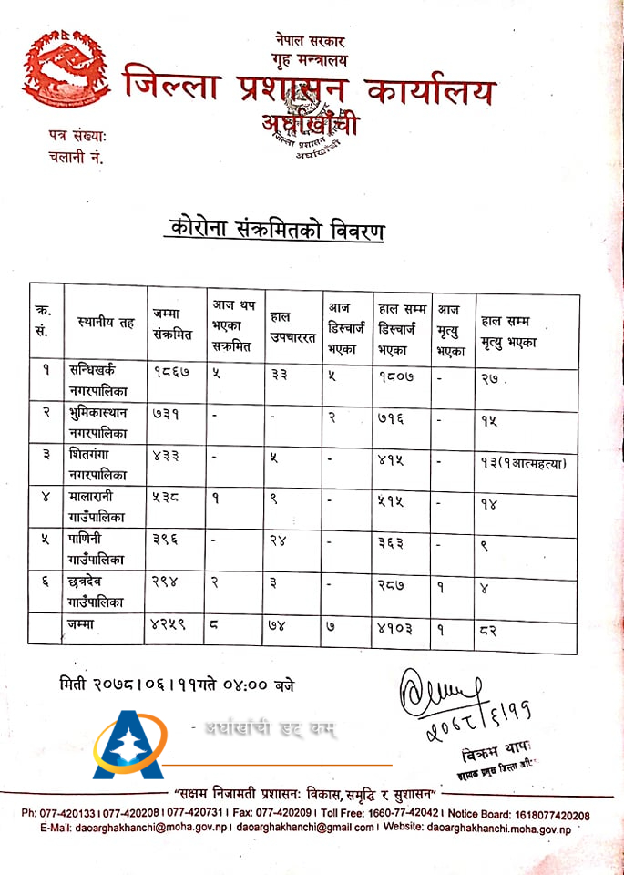 साथै पछिल्लो २४ घण्टामा ७ जनाले कोरोना जितेका छन् । जिल्लामा गत वर्षदेखि आजसम्म ४१०३ जनाले कोरोना जितेका छन् । जसमा सन्धिखर्क नगरपालिकामा १८०७ जना, भूमिकास्थान नगरपालिकामा ७१६ जना, शितगंगा नगरपालिकामा ४१५ जना, मालारानी गाउँपालिकामा ५१५ जना, पाणिनी गाउँपालिकामा ३६३ जना र छत्रदेव गाउँपालिकामा २८७ जनाले कोरोनालाई जितेका हुन् ।