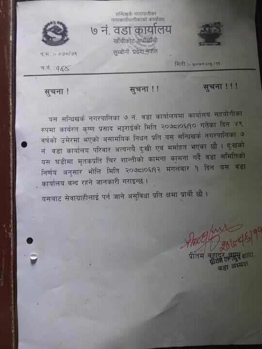 फुदवाङ, अर्घाखाँची ( अर्घाखाँचीडट्कम) । अर्घाखाँची जिल्लाको सन्धिखर्क नगरपालिका वार्ड नम्बर ७ खाँचीकोटमा कर्मचारीको निधनको शोकमा भोली मंगलवार वार्ड कार्यालय बन्द हुने भएको छ ।