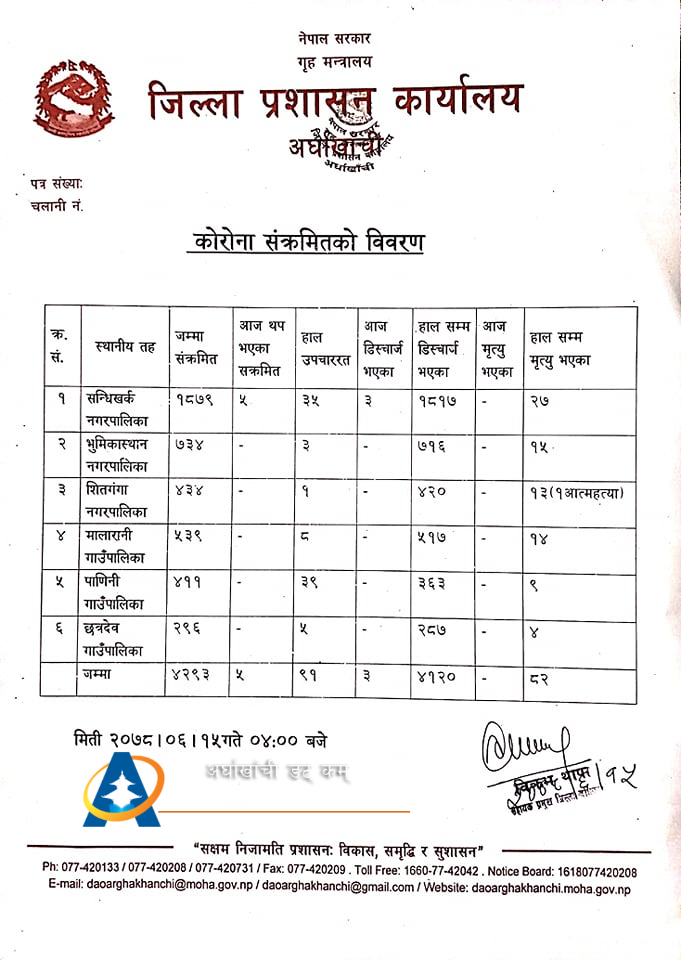सन्धिखर्क, अर्घाखाँची (अर्घाखाँचीडट्कम) । अर्घाखाँची जिल्लामा पछिल्लो २४ घण्टामा थप ५ जना कोरोना संक्रमित थपिएका छन् ।