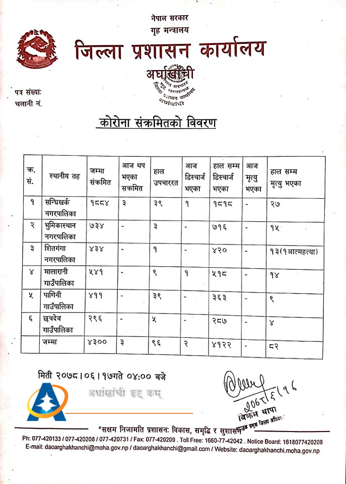 सन्धिखर्क, अर्घाखाँची (अर्घाखाँचीडट्कम) । अर्घाखाँची जिल्लामा पछिल्लो २४ घण्टामा थप ३ जना कोरोना संक्रमित थपिएका छन् ।