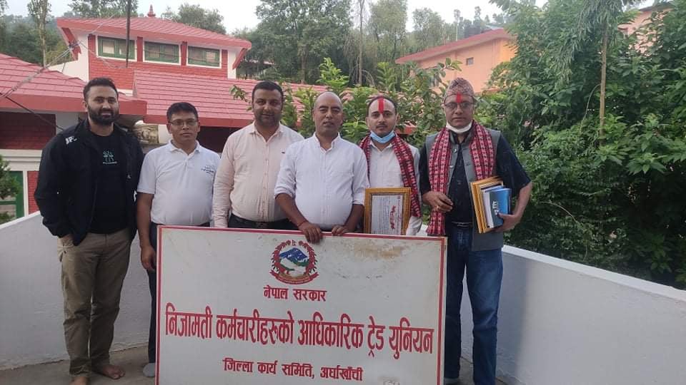 आधिकारिक ट्रेडयुनियन अर्घाखाँचीका जिल्ला अध्यक्ष झबिन्द्र खनालको अध्यक्षता बिकल्प भट्टराईको सन्चालन कृष्ण बर्माको सन्चालनमा सम्पन्न भएको कार्यक्रममा जिल्लाबाट विदाई भई शिक्षा प्रबिधि मन्त्रालयमा सरुवा हुनुभएका ट्रेडयुनियनका उपाध्यक्ष बलाराम मिश्र ट्रेड युनियनका सचिब बिबेक पन्तलाई विदाई तथा जिल्ला निर्वाचन अधिकारी सुरेस भण्डारीलाई स्वागत गरिएको थियोे ।