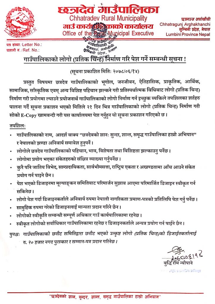 छत्रदेव, अर्घाखाँची । अर्घाखाँची जिल्लाको छत्रदेव गाउँपालिकाले आफ्नो पालिकाको पहिचान हुने गरि लोगो (प्रतिक चिन्ह) निर्माण गर्ने भएको छ ।