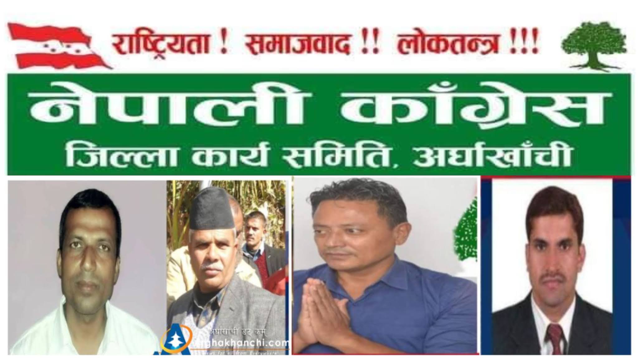 नेपाली कांग्रेसको १४औं महाधिवेशनको मिति नजिकिदै गर्दा अर्घाखाँचीमा जिल्ला सभापतिको नेतृत्व लिन अहिलेसम्म चार जना अग्रसर देखिएका छन् । जसमध्ये वर्तमान सभापती बिष्णुप्रसाद खनाल मुस्कान, महासमिती सदस्य केशब श्रेष्ठ, नेपाल शिक्षक संघका जिल्ला अध्यक्ष यादव घिमिरे र महाधिवेशन प्रतिनिधी ईन्द्रमणी पौडेलले सभापतीमा दावी गरेका छन् । महाधिवेशनको मिति नजिकिदै गर्दा जिल्लामा चहलपहल दिन प्रतिदिन बढ्दै गएको छ । यो संगै अहिले सम्मको जानकारीअनुसार सभापतिका चारै जना दाबेदार चुनावी मैदान बाट पछि नहटने भनेका छन ।सोहि अनुसार पर्चा पम्पलेट र ब्यानरद्धारा नेता तथा कार्यकर्ता हरु प्रचार पसारमा लागेका छन ।