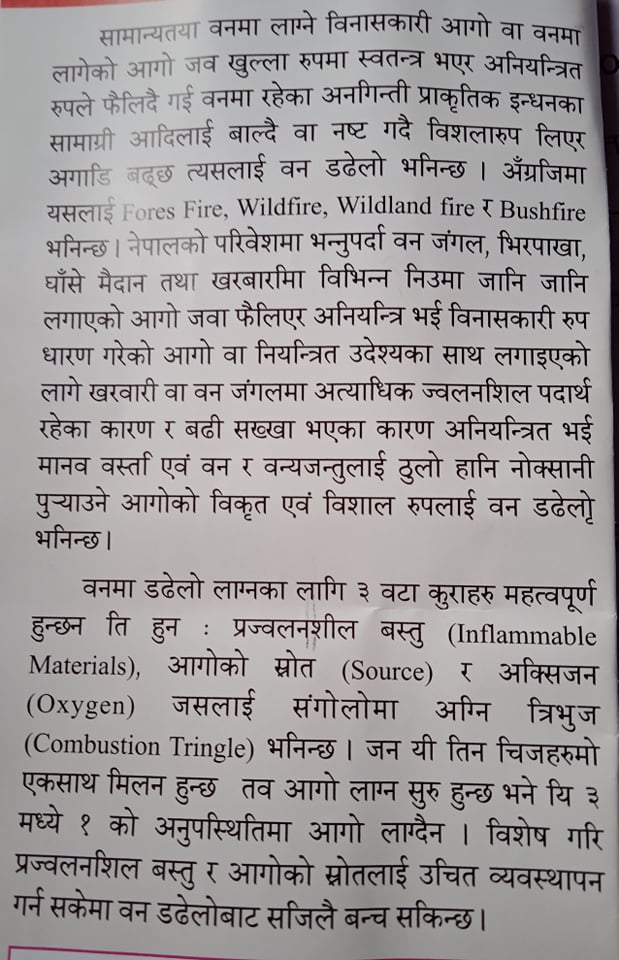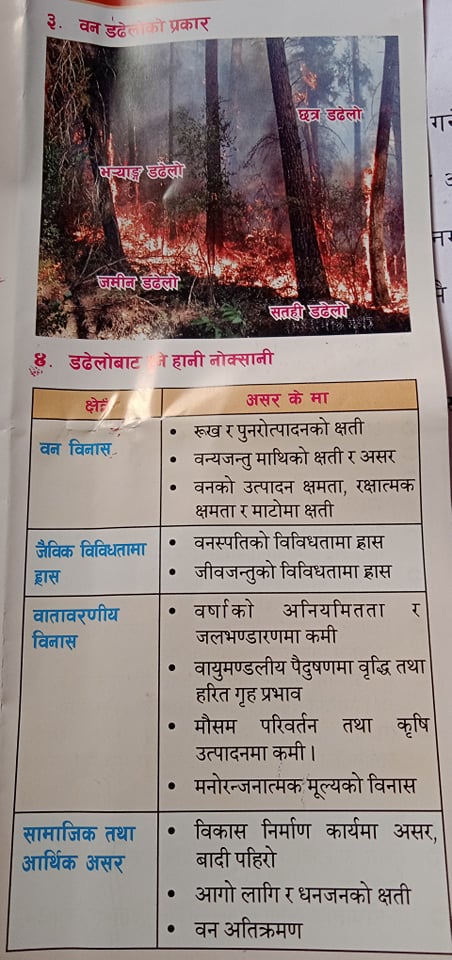 ५)वन डढेलोले सयौं बर्षका बोटबिरुवा क्षणभरमै नस्ट गर्न सक्छ , त्यसैले वनमा आगो नलगाऔं ।