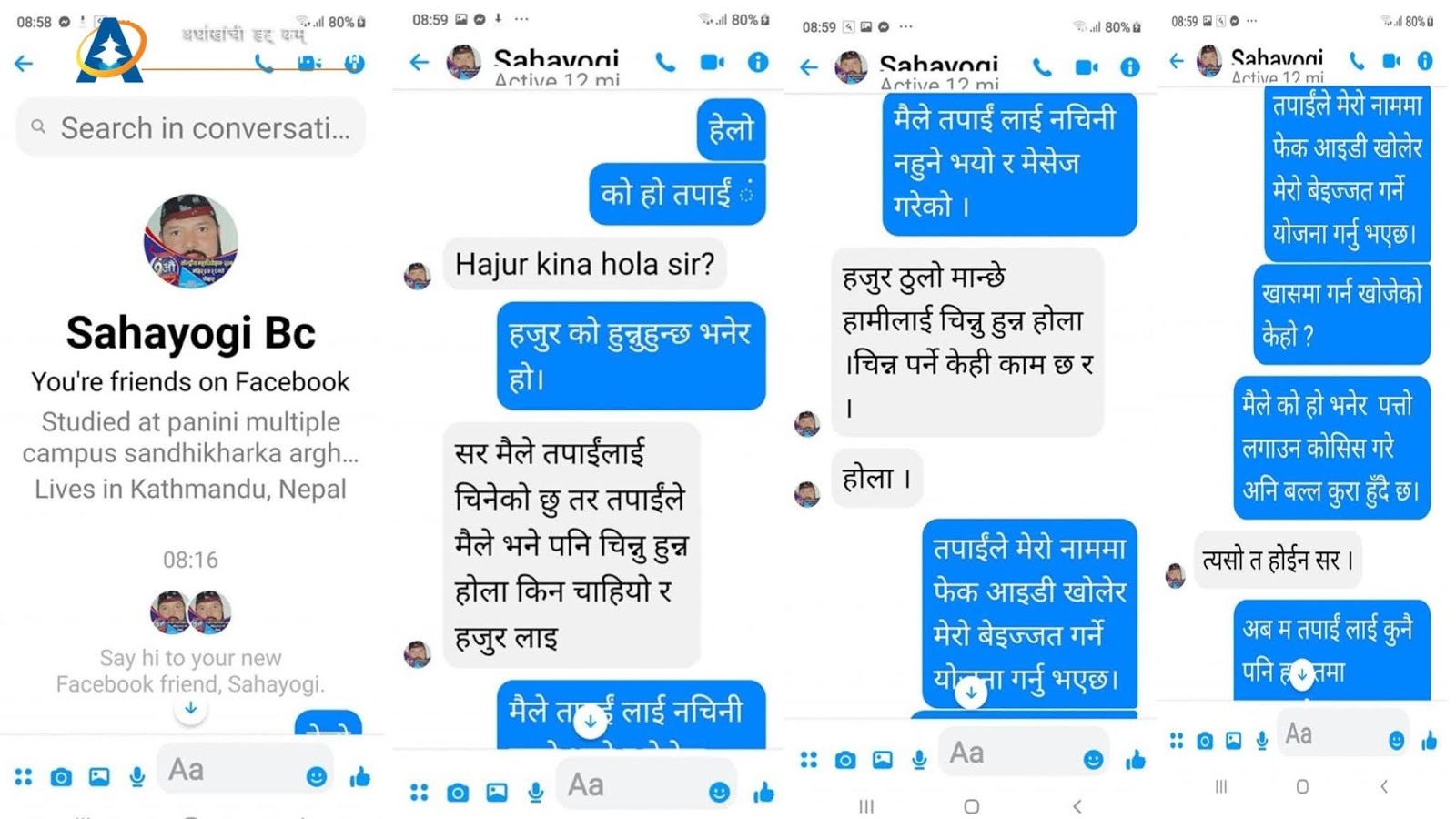 यस्तै बिसीले नयाँ फेक फेसबूक अकाउन्टबाट कुरा गरेको भनि संवाद भएको स्क्रिनसर्ट प्रमाण देखाए अनुसार फेक अकाउन्टबाट कुरा गर्दा सहज तरिकाले दोहोरो काल्पनिक कुरा भएको देखिन्छ । जुन चोरले चोर्न पनि नजानेको भने जस्तै केटाकेटीको जस्तो सजिलै थाहा लाग्ने संवादको स्क्रिनसर्ट पोस्ट गरेको देखिन्छ। फेक काम गर्नेले हजुर मैले गल्ती गरे, मलाई थाहा थिएन् भनी यसरी सहज तरिकाले दोहोरो वार्तालाभ गरेको विश्वको कुनै पनि देशमा प्रहरीले अपराधिक घटनामा गरेका अनुसन्धानमा देखिदैन् । बिसीले पोस्ट गरेको स्क्रिनसर्ट हेर्दा फेक वाला Sahayogi Bc आज बिहान ०८:१६ देखि ९:०० बजेसम्म एक्टिभ देखिन्छ। साथै बिसीले स्क्रिनसर्ट पोस्ट गरेपनि फेक अकाउन्टको लिन्क देखाएका छैनन् ।