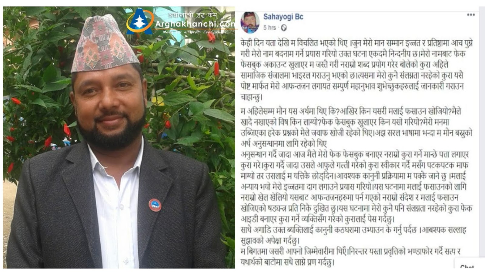 सन्धिखर्क, अर्घाखाँची (अर्घाखाँचीडट्कम)  । अर्घाखाँची जिल्लामा एक विवाहित युवतीलाई यौन दुर्व्यवहार गरेको आरोप खेपेका समाजसेवी सहयोगी बिसीले नयाँ फेक फेसबूक अकाउन्ट बनाएर घटनामा आफुलाई फसाउन प्रयास गरेको दावी गरेका छन् ।