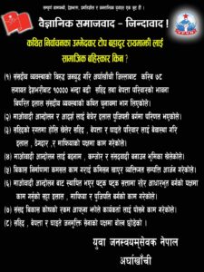 नेपाल कम्युनिस्ट पार्टी(बहुमत) निकट युवा जनस्वयम सेवक नेपाल,अर्घाखाँचीले नेकपा (एमाले) नेता टाेप बहादुर रायमाझीकाे घरमा कालाे ब्यानर टाँगेकाे छ । उनि उमेदवार उठेको निर्वाचन स्थलका सार्वजनिक स्थलहरुमा पनि उनलाई अासन्न निर्वाचनका उम्मेदवार टोप बहादुर रायमाझीलाई सामाजिक बहिस्कार किन ? भन्दै कालाे ब्यानर टाँगिएको छ ।
