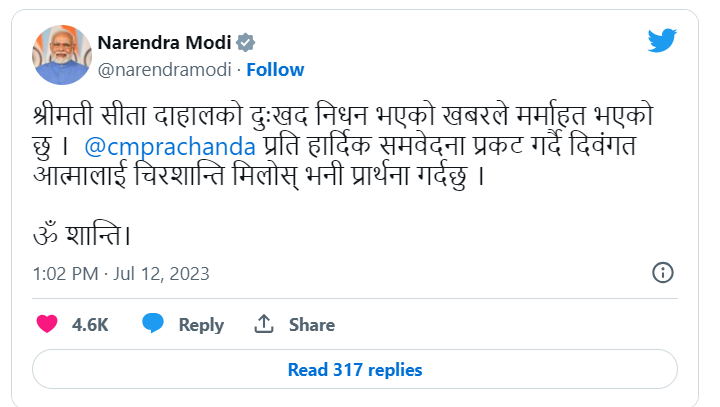 भारतीय प्रधानमन्त्री मोदीले सीता दाहालको निधनको खबरले मर्माहत भएकोसमेत बताएका छन् । उनले लेखेका छन्, ‘श्रीमती सीता दाहालको दुःखद निधन भएको खबरले मर्माहत भएको छु । पुष्पकमल दाहालप्रति हार्दिक समवेदना प्रकट गर्दै दिवंगत आत्मालाई चिरशान्ति मिलोस् भनी प्रार्थना गर्दछु ।’