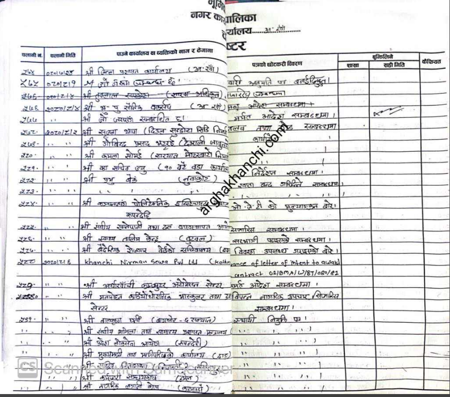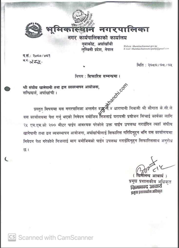 यद्यपि अर्घाखाँची डटकमको टोलि नगरपालिका पुगि चलानी पुस्तिका हेर्दा सोही मितिको सोही चलानी नम्बरमा संघीय खानेपानी आयोजना अर्घाखाँचीलाई पाइप माग सम्बन्धी सिफारिश पठाएको देखिएको छ ।
