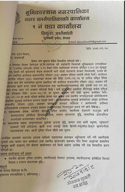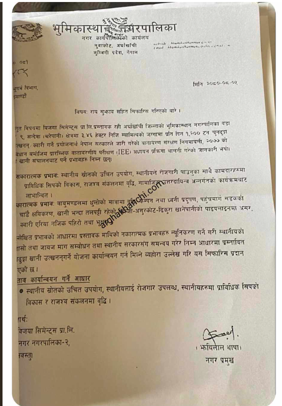 भुमिकास्थान नगरपालिकाको पत्रमा २०८०-०८-०५ गतेको मितिमा चलानी नम्बर ५८५ उल्लेख गरि गरिएको सिफारिश पत्रमा खानि तथा भुगर्भ बिभागलाइ अनुमती सहित सिफारिश दिएको पत्र आए पछि सिङ्गो नगर बिवादमा आएको हो । नगरपालिकाले उक्त पत्र किर्ते भएको भन्दै खानी अनुमती बदर गर्न खानी बिभागलाइ पत्राचार गरेको छ ।