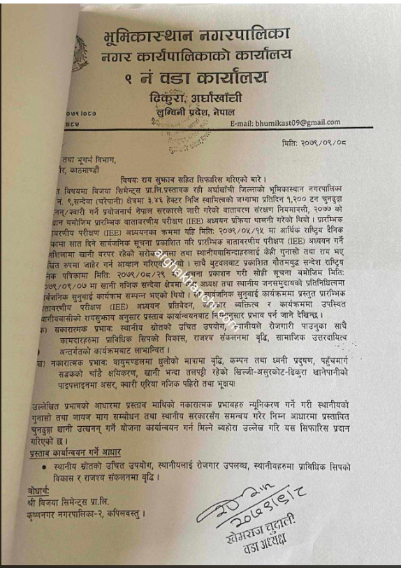 मार्फत विजया सिमेन्टले प्राप्त गरेको चुनढुङ्गा उत्खनन अनुमति पत्र पूर्णरुपले खारेज गरि भूमिकास्थान नगरपालिकालाई जानकारी उपलब्ध गराउन भनी खानी तथा भुगर्भ विभागलाई पत्रचार समेत गरेको नगरप्रमुख थापाले बताए।