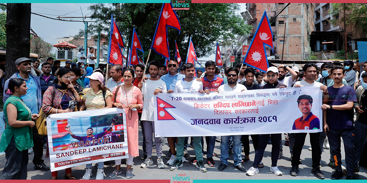 काठमाडौं । क्रिकेटर सन्दीप लामिछानेलाई अमेरिका जाने भिसा दिन माग्दै बुधबार उनका समर्थकले काठमाडौँमा प्रदर्शन गरेका छन् । ‘भिजा फर सन्दीप लामिछाने’ भन्दै माइतीघरमा विरोध प्रदर्शन गरिएको हो ।