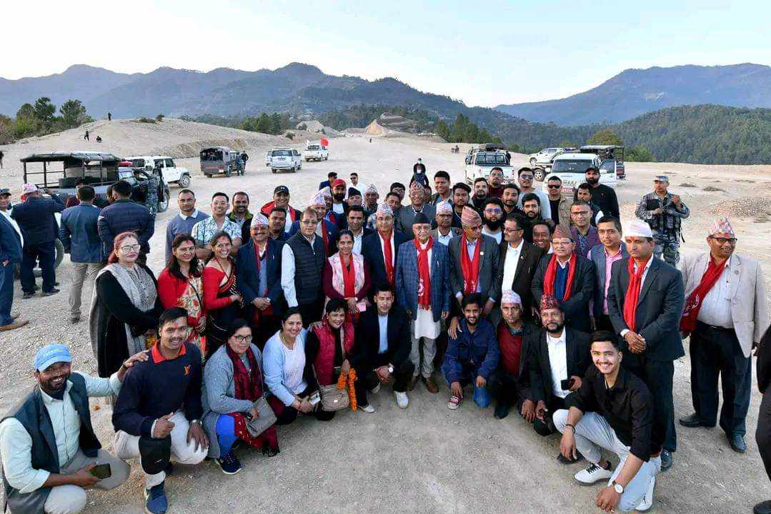 निर्माणाधिन विमान स्थलको नेकपा एमालेका अध्यक्ष तथा प्रधानमन्त्री केपि सर्मा वोलिले समेत निरिक्षण गरि तत्काल बजेट ब्यबस्थापनका लागि पहल गर्ने बताएका थिए। प्रधानमन्त्री अोलि निरिक्षणमा अाउदा पुर्व प्रधानमन्त्रीको हैसियतले निरिक्षण गरेपनि अहिले प्रधानमन्त्री छन । नेकपा एमालेका केन्द्रीय सदस्य तत्कालीन प्रदेश सान्सद चेतनारायण अाचर्य अहिले लुम्बिनी प्रदेशको मुख्यमन्त्री बनेका छन ।
