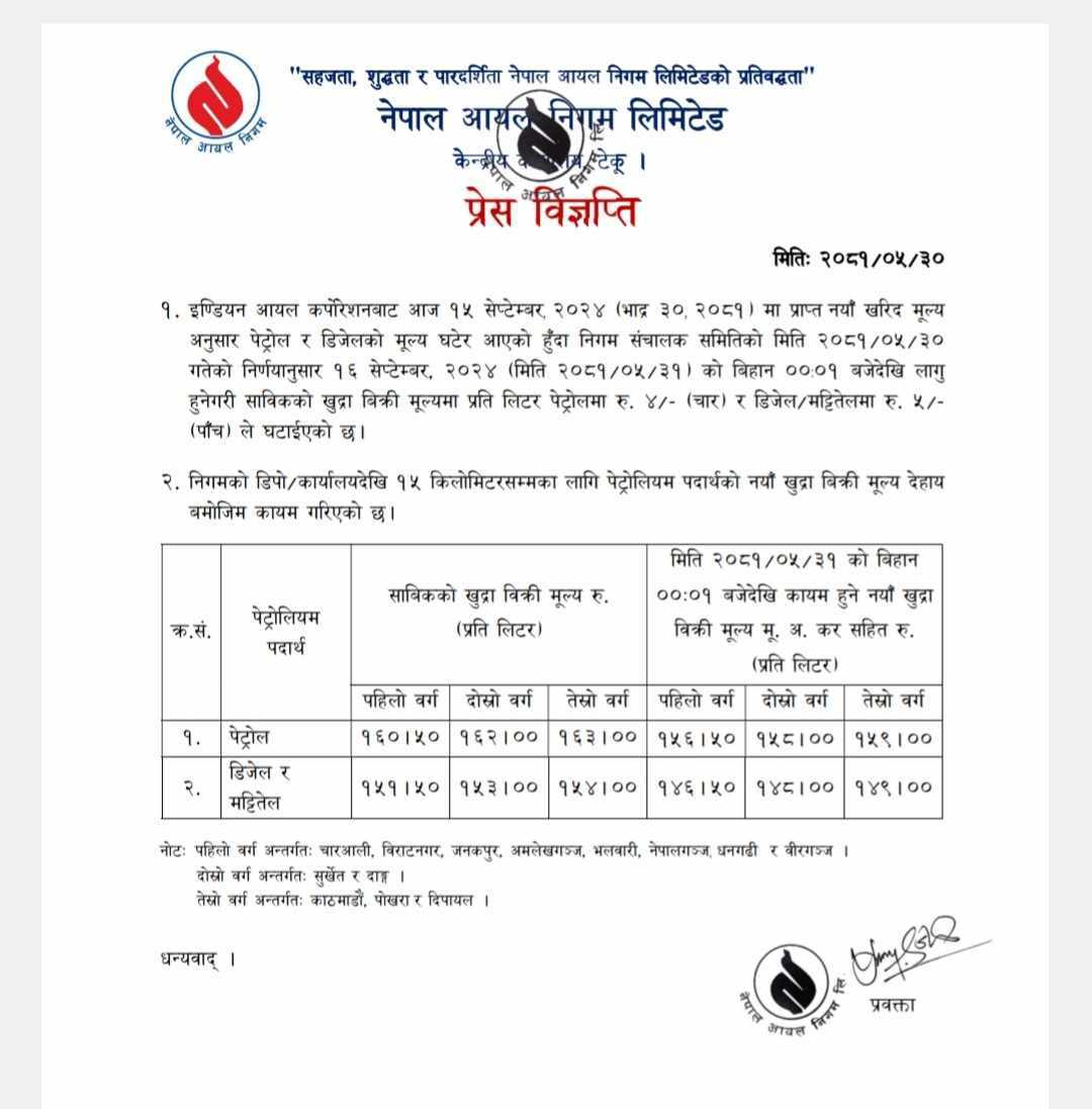 आइतबार साँझ बसेको निगम सञ्चालक समितिको बैठकले पेट्रोलमा प्रतिलिटर ४ रुपैयाँ र मट्टितेल तथा डिजेलमा प्रतिलिटर ५ रुपैयाँ मूल्य घटाएको हो ।