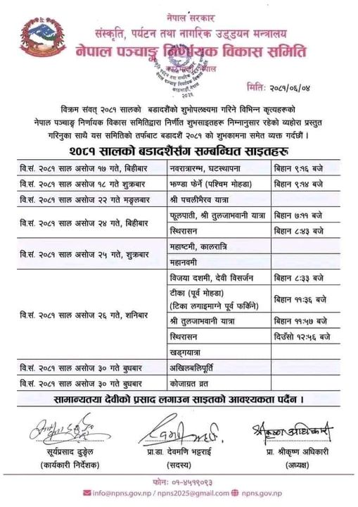 असोज १८ गते झण्डा फेर्ने साइत छ । यस दिन बिहान ९ बजेर १४ मिनेटमा पश्चिम फर्किएर झण्डा फेर्नुपर्ने समितिले जनाएको छ ।