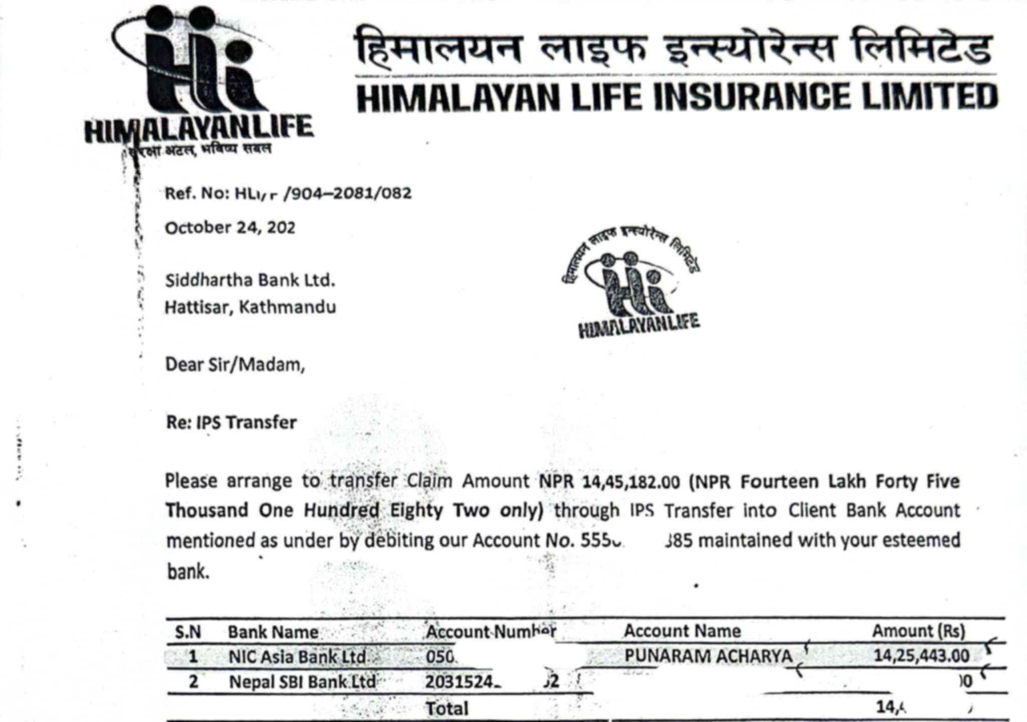 केही वर्ष अगाडि हिमालायन लाइफ इन्स्योरेन्समा रु १५ लाखको बिमाङ्क रहने गरि जीवन बिमा गरेका बिमित पुनारामले भारतको दिल्लीमा उपचार गरि घातक रोग बापतको रकम प्राप्तिको निम्ति सम्पुर्ण मेडिकल रिपोर्ट केही दिन अगाडि अर्घाखाँची शाखामा पेश गरेका थिए ।