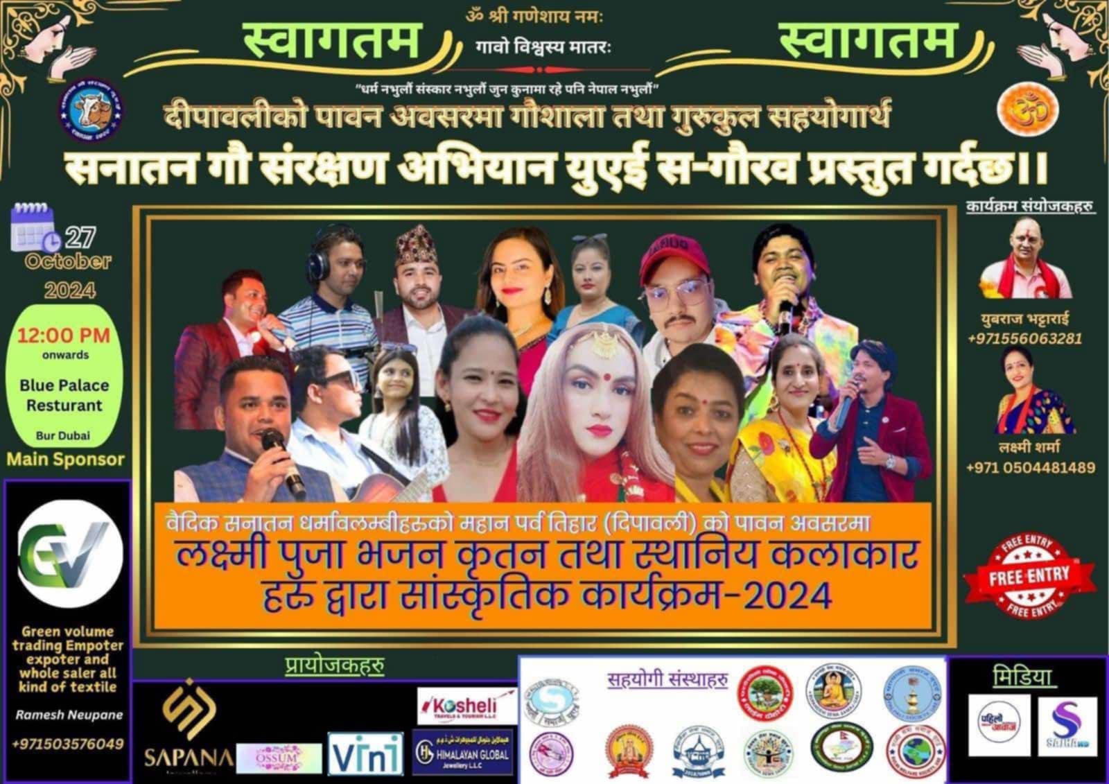आईतवार २७, अक्टुवर २०२४ का दिन दुवइ सहरको बरदुवई स्थित ब्ल्यु प्लालेस रेस्टुरेन्टको सभा हलमा “धर्म नभुलौं संस्कार नभुलौं जुन कुनामा रहे पनि नेपाल नभुलौं”* भन्ने उद्देश्यको साथ् वैदिक सनातन धर्मावलम्बीहरुको महान पर्व तिहारको पावन अवसरमा गौशाला तथा गुरुकुल सहयोगार्थ लक्ष्मी पुजा भजन कृतन , देउसी भैलो तथा सांस्कृतिक कार्यक्रम भव्यताको साथ् सम्पन्न गरेको छ।