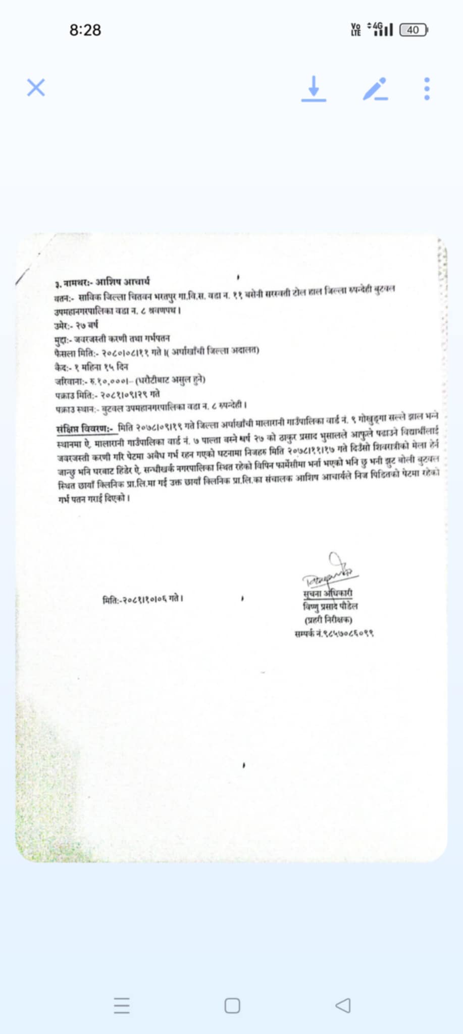 फरार प्रतिवादीलाई खोज्ने क्रममा अर्घाखाँचीबाट खटिएको प्रहरीले श्रेष्ठलाई माघ ६ गते सन्धिखर्क–१, गुण्टेखोला बाट नियन्त्रणमा लिएको जनाएको छ । यता जिल्ला अदालत अर्घाखाँचीले नै २०८० मंसिर ११ मा १ महिना १५ दिन कैद र १० हजार जरिवाना हुने गरी रुपन्देहीको बुटवल उप–महानगरपालिका–८, श्रवणपथका २७ वर्षीय आशिष आचार्य विरुद्ध फैसला भएकोमा अवैधानिक गर्भपतन गराइदिएको मुद्दाका फरार प्रतिवादी आचार्यलाई प्रहरीले गत पौष २९ मा पक्राउ गरेको हो ।