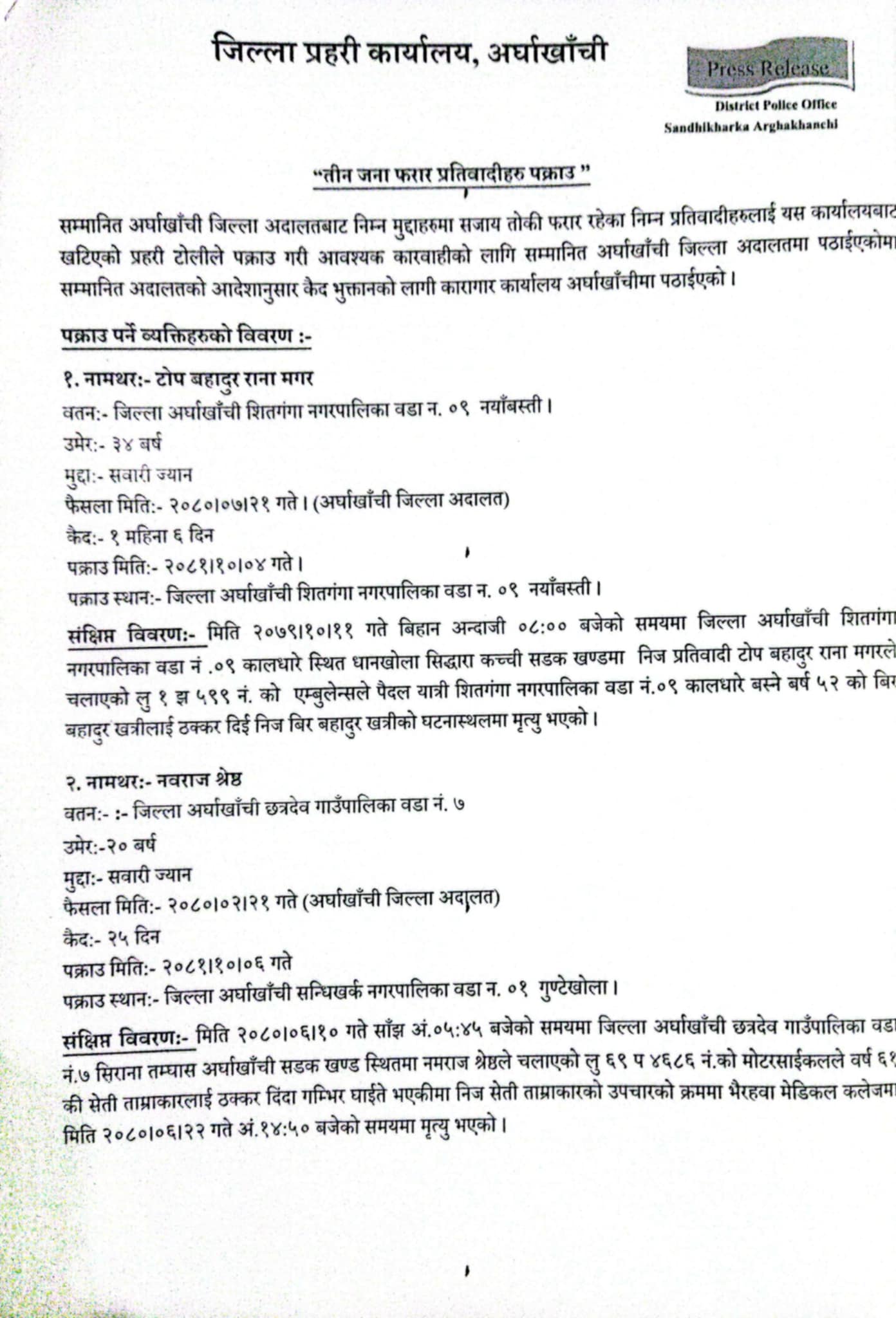 सवारी ज्यान मुद्दामा जिल्ला अदालत अर्घाखाँचीबाट २०८० कार्तिक २१ मा १ महिना ६ दिन कैद सजांय हुनेगरी शितगंगा–९, नयाँबस्तीका ३४ वर्षीय टोप बहादुर राना मगरको बिरुद्धमा फैसला भएकोमा फरार रहेका उनलाई प्रहरीले पक्राउ गरेको हो ।