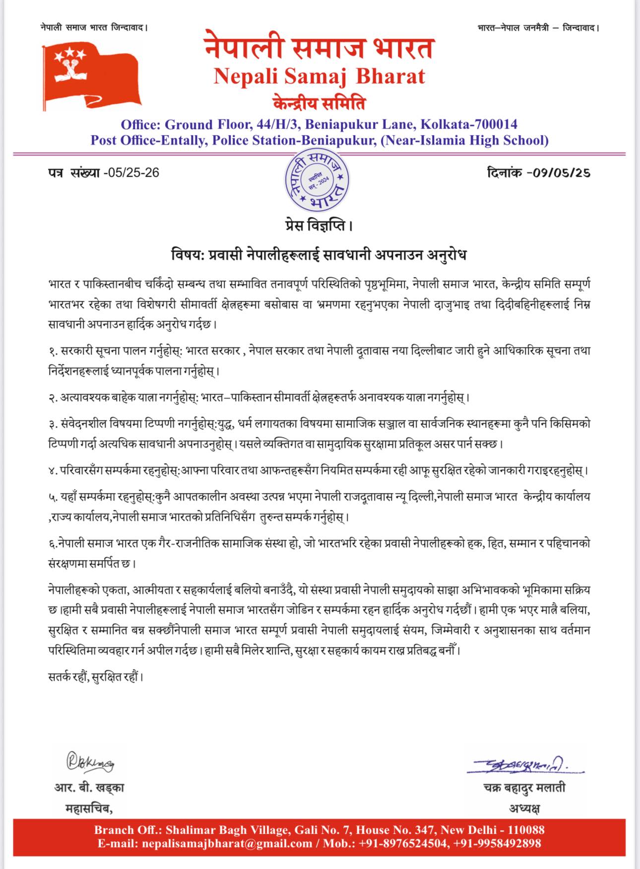 भारत र पाकिस्तानबीच चर्किंदो सम्बन्ध तथा सम्भावित तनावपूर्ण परिस्थितिको पृष्ठभूमिमा, नेपाली समाज भारत, केन्द्रीय समिति सम्पूर्ण भारतभर रहेका तथा विशेषगरी सीमावर्ती क्षेत्रहरूमा बसोबास वा भ्रमणमा रहनुभएका नेपाली दाजुभाइ तथा दिदीबहिनीहरूलाई निम्न सावधानी अपनाउन हार्दिक अनुरोध गर्दछ।