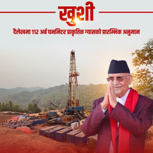 ‘दैलेखमा पेट्रोलियम पदार्थको अन्वेषण सुरु गर्दाका दिनहरू सम्झिरहेको छु, समर्थन र विरोध–आवाज थरिथरिका थिए,’ ओलीले लेखेका छन, ‘११२ अर्ब घनमिटर ग्याँस रहेको खबरले ती दिनलाई सम्झाएको छ, यो खुसीको समाचार हो।’