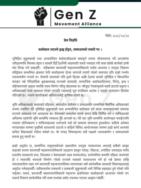 जेन–जी मुभेन्ट अलायन्सले काठमाडौं महानगरपालिकाले महानगर क्षेत्रभित्रका बस्तीहरूको अध्यायन गरेको भए यथार्थ विवरण सार्वजनिक गरि स्पष्ट तथ्यांक समेत उपलब्ध गराउन अलायन्सले आह्वान गरेको छ ।