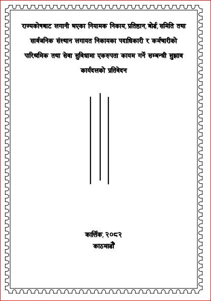 उक्त बुँदामा नियमनकारी निकाय, प्रतिष्ठान र समितिलाई समेटेको देखिँदैन । फलस्वरुप कतिपयले नियमावलीरविनियमावली तर्जुमा गर्दा वा नेपाल सरकारको भन्दा फरक तलब सुविधा निर्धारण गर्दा अर्थ मन्त्रालयको सहमति नलिएको कारण सेवा सुविधामा विविधता देखियो,’ प्रतिवेदनमा उल्लेख छ ।