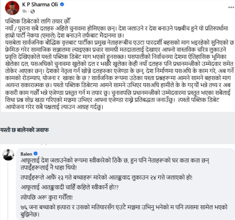 नेकपा एमालेका अध्यक्ष केपी ओलीले ‘पब्लिक डिबेट’को लागि आफू तयार भएको सामाजिक सञ्जालमार्फत बताएपछि सोहि स्ट्याटसमा कमेन्ट गर्दै बालेनले त्यसलाई अस्विकार गरेका हुन् ।