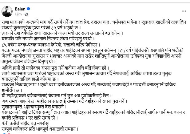 ‘८५ वर्ष पहिलेजस्तै, यसपालि पनि भदौको जेनजी आन्दोलनमा सुशासन र भ्रष्टाचार अन्त्यको माग राखेर शान्तिपूर्ण आन्दोलनमा उत्रिएका युवा र विद्यार्थीले आफ्नो अमूल्य जीवन बलिदान दिनुपर्यो । अहिले हामी ती शहीदका सपना पुरा गर्ने बाटोमा अघि बढिरहेका छौँ । लामो सयमसम्म जरा गाडेको भ्रष्टाचारको अन्त्य गरी सुशासन कायम गर्दै नेपाललाई आर्थिक रूपमा उन्नत मुलुक बनाउनुपर्ने दायित्व हाम्रो काँधमा छ । राज्यका निकायहरूमा भएको चरम दलीयकरणको अन्त्य गर्दै राज्यलाई जवाफदेही र पारदर्शी बनाउनुपर्ने दायित्व हामीसँग छ । अब समय आएको छ–शहीदका रगतलाई सम्मान गर्दै वहाँहरूको सपना पुरा गर्ने । सुशासनयुक्त, भ्रष्टाचारमुक्त देश बनाउने’,शाहले उल्लेख गरेका छन् ।