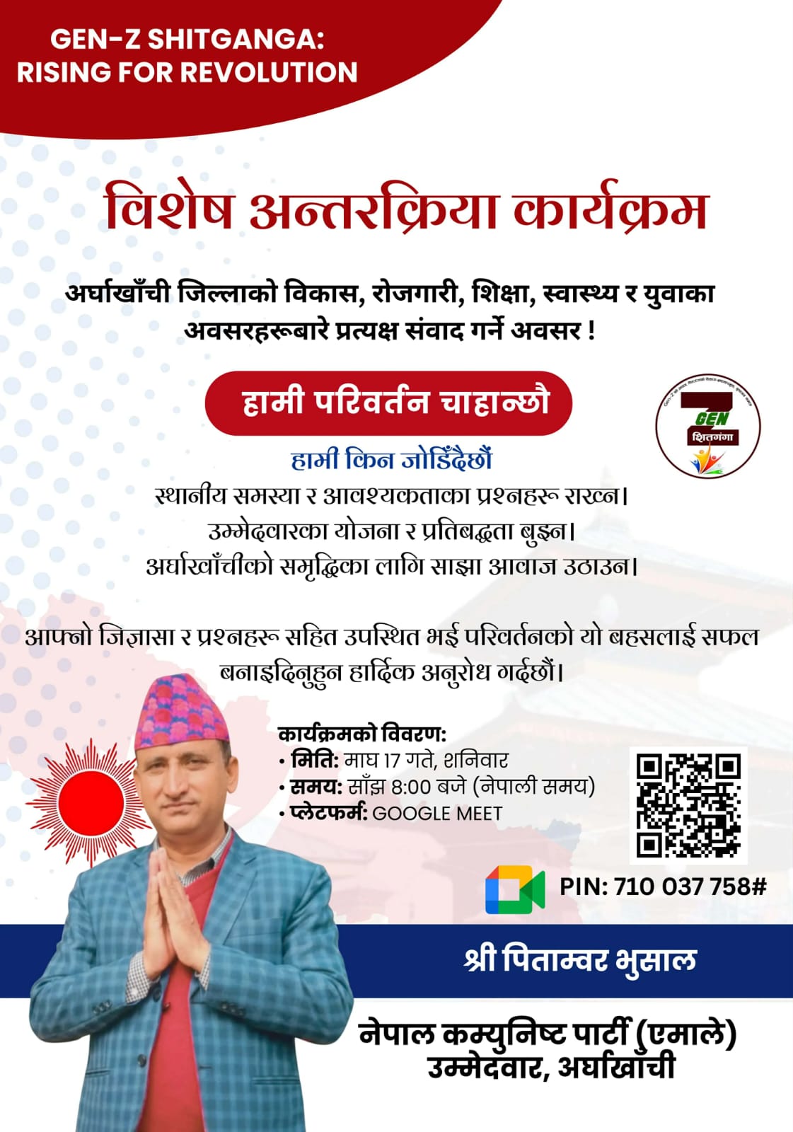 यसै अभियान अन्तर्गत आगामी शनिबार माघ १७ गते (जनवरी ३१, २०२६) राति ८:०० बजे नेकपा (एमाले) का उम्मेदवार पिताम्वर भुसालसँग विशेष अन्तरक्रिया हुने भएको छ।
