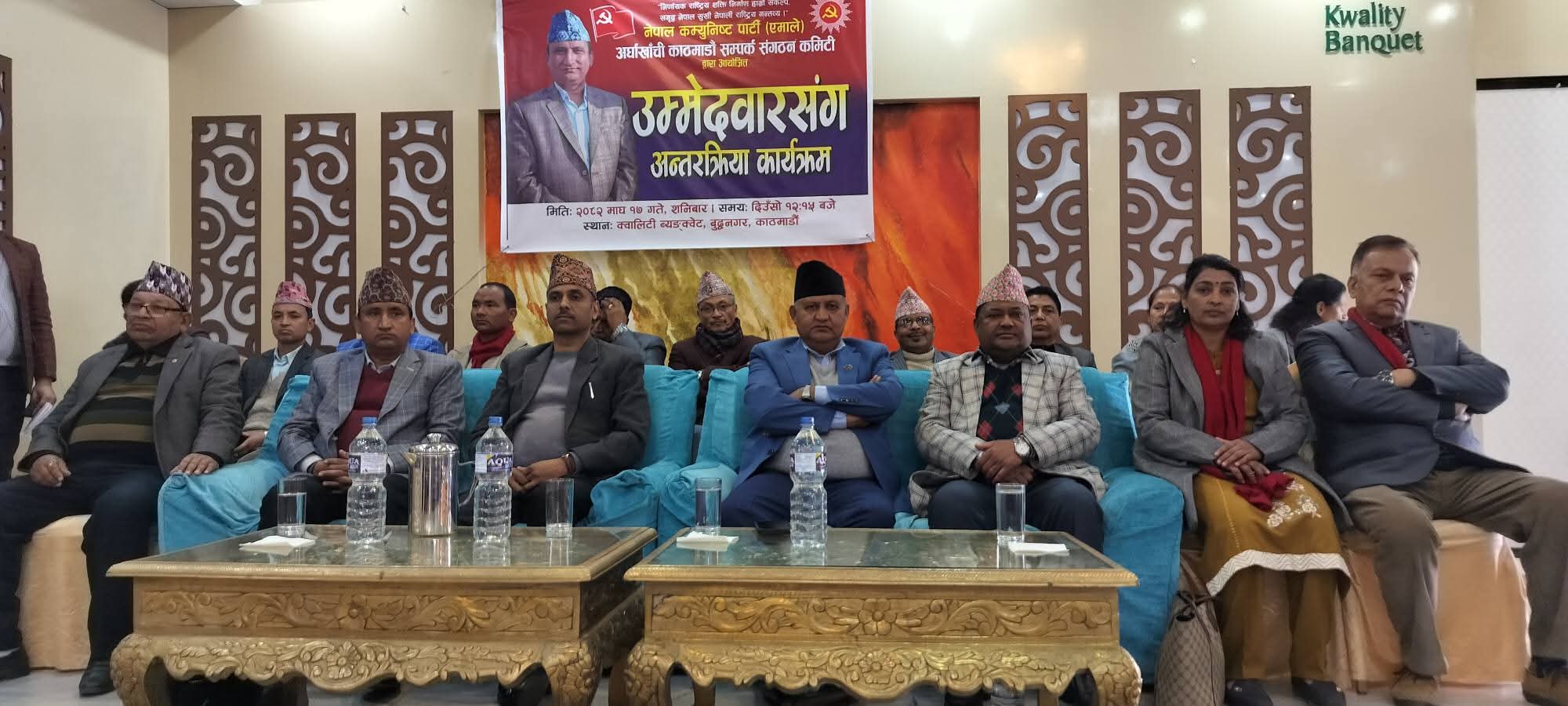 काठमाडौं – नेपाल कम्युनिष्ट पार्टी (एमाले) अर्घाखाँची–काठमाडौं सम्पर्क संगठन कमिटीको आयोजनामा उमेदवारसँग अन्तरक्रिया कार्यक्रम आज शनिबार माघ १७ गते राजधानी काठमाडौंको क्वालिटी ब्याङ्क्वेटमा भव्य र अनुशासित वातावरणमा सम्पन्न भएको छ। आसन्न निर्वाचनलाई लक्षित गरी आयोजना गरिएको उक्त कार्यक्रमले काठमाडौंमा बसोबास गर्दै आएका अर्घाखाँचीवासी एमाले नेता–कार्यकर्ता, शुभेच्छुक तथा समर्थकहरूलाई एकै ठाउँमा एकताबद्ध गर्ने महत्वपूर्ण अवसर प्रदान गरेको छ।