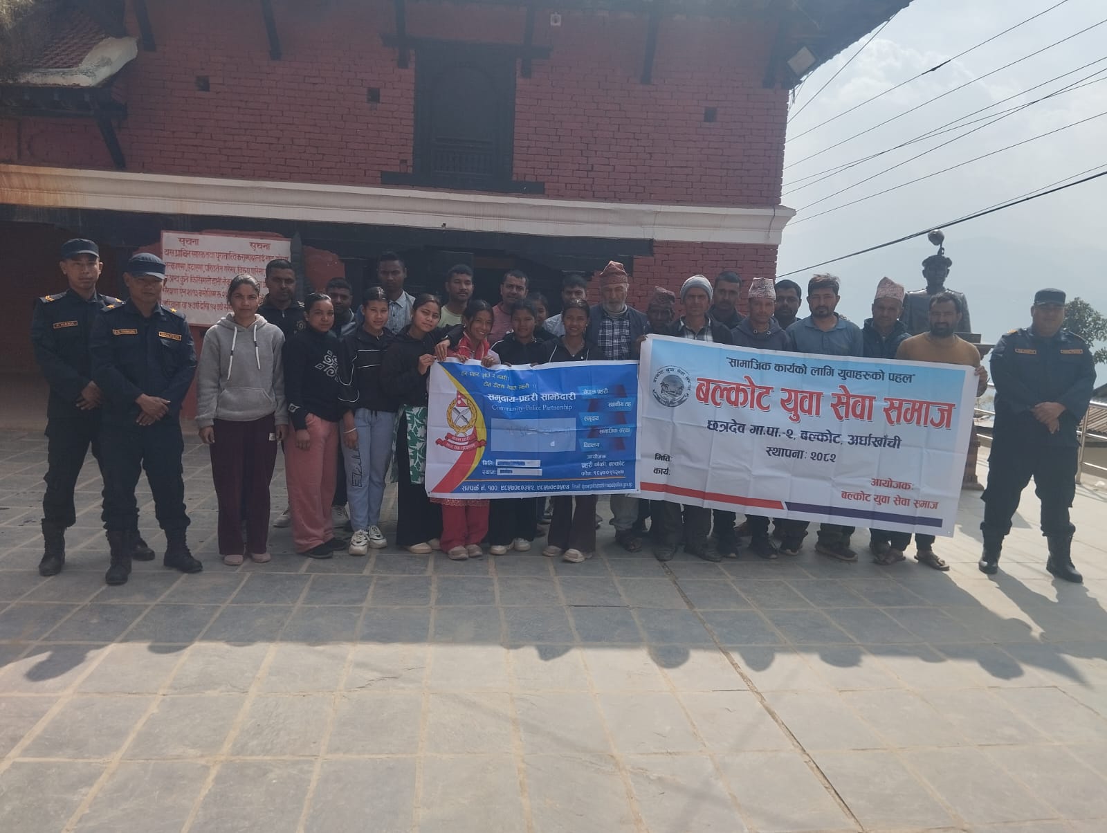 बल्कोट युवा समाज नेपाल र बल्कोट प्रहरी चौकीको ‘समुदाय–प्रहरी साझेदारी कार्यक्रम’ अन्तर्गत शनिबार बिहान सरसफाइ कार्यक्रम राखिएको बल्कोट युवा समाज नेपालका अध्यक्ष अर्जुन पाण्डेले जानकारी दिनुभयो। उहाँका अनुसार, “हाम्रो गाउँको पहिचानसँग जोडिएको ऐतिहासिक पौवा र शिवालय मन्दिरलाई स्वच्छ, सफा र व्यवस्थित राख्नु सबैको दायित्व हो। यही सोचका साथ युवाहरूले अग्रसरता लिएका हुन्।”