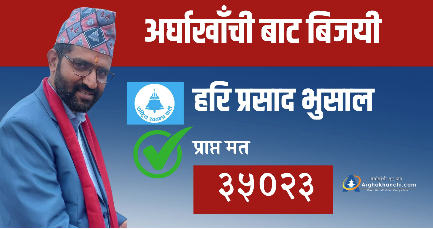 अर्घाखाँची — प्रतिनिधि सभा सदस्य निर्वाचनमा राष्ट्रिय स्वतन्त्र पार्टी (रास्वपा) का उम्मेदवार हरि प्रसाद भुसाल अर्घाखाँचीबाट ३५,०२३ मत प्राप्त गरि विजयी भएका छन्। निकटतम प्रतिस्पर्धी पीताम्बर भुसाल ( प्राप्त मत २२,६४९ ) लाई पराजित गर्दै उनले संघीय संसदको यात्रा तय गरेका हुन्।
