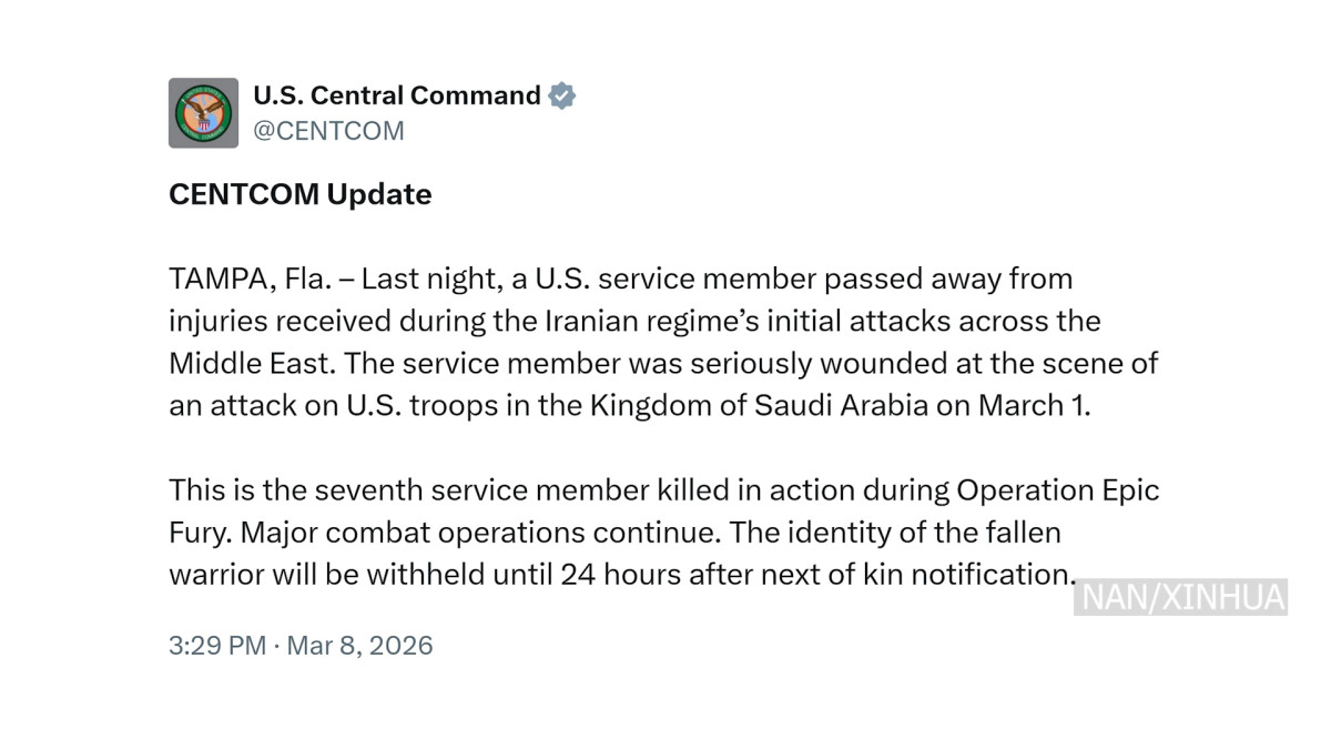 अमेरिकी केन्द्रिय कमाण्डले जनाएअनुसार अमेरिका र इजरायलले फेब्रुअरी २८ मा इरानविरुद्ध शुरु गरेको आक्रमणका क्रममा सातौं अमेरिकी सैनिकको मृत्यु भएको छ ।