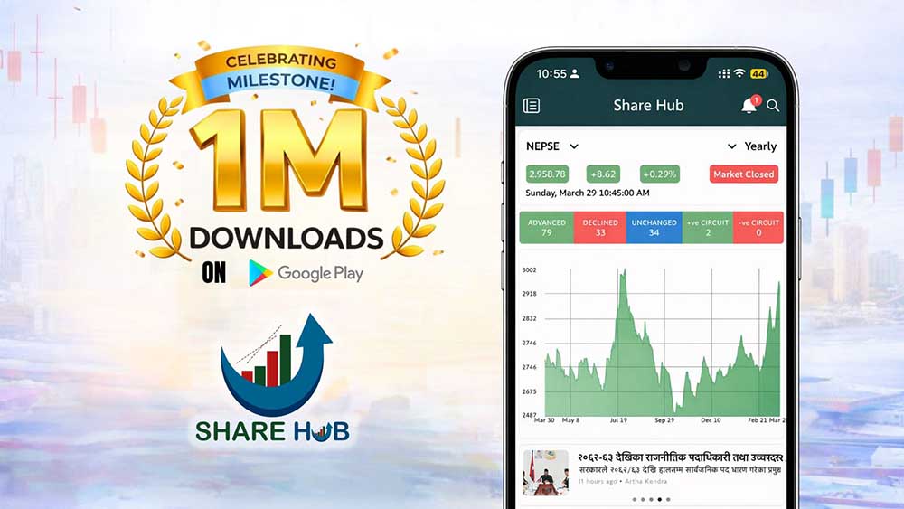 काठमाडौँ । नेपाली पूँजी बजारसम्बन्धी सूचना तथा विश्लेषणलाई सहज रूपमा आम प्रयोगकर्तासम्म पुर्याउने उद्देश्यले विकास गरिएको ‘शेयर हब’ (Share Hub) एपले गुगल प्ले स्टोरमा १० लाख डाउनलोड पार गर्दै महत्वपूर्ण उपलब्धि हासिल गरेको छ। छोटो समयमै यस्तो उपलब्धि हासिल गर्नु नेपाली फिनटेक क्षेत्रमा उल्लेखनीय प्रगति मानिएको छ ।