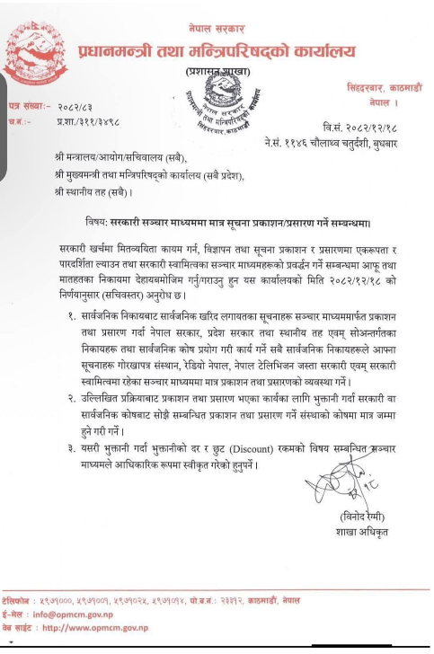 प्रधानमन्त्री तथा मन्त्रिपरिषदको कार्यालयले सरकारी खर्चमा मितव्ययिता कायम गर्न, विज्ञापन तथा सूचना प्रकाशन प्रशारणमा एकरुपता र पारदर्शिता ल्याउन सरकारी स्वामित्वका सञ्चारमाध्यमहरुको प्रवर्द्धन गर्न आफू तथा आफू मातहतका निकायहरुलाई सर्कुलर जारी गरेको छ ।