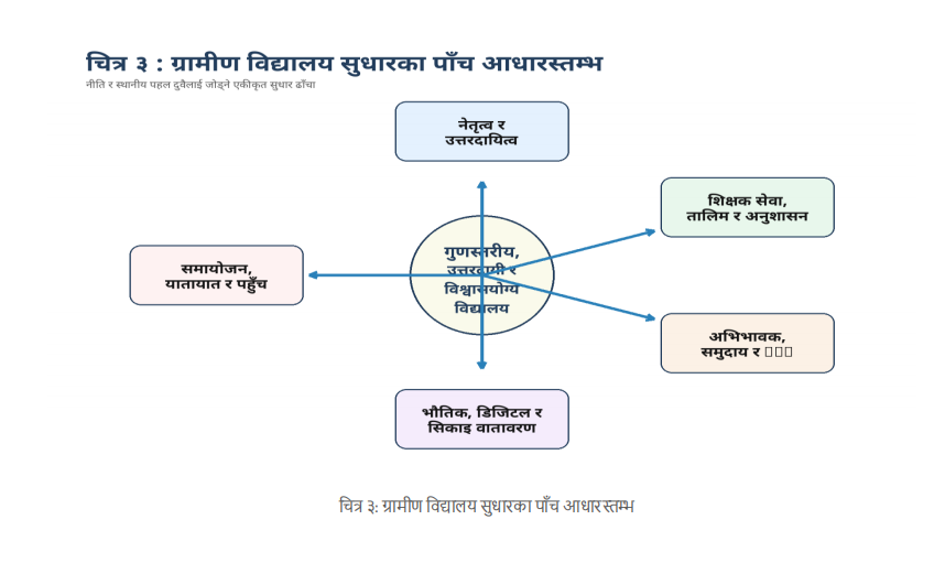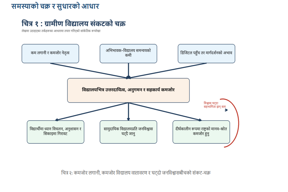 ग्रामीण तथा सरकारी विद्यालयहरूको समस्या बहुआयामिक छ—भौतिक स्रोत, शिक्षण गुणस्तर, शिक्षक उत्तरदायित्व, विद्यार्थी प्रेरणा, अभिभावक सहभागिता र राजनीतिक संस्कार सबै यससँग जोडिएका छन्। तर सुधार असम्भव छैन।
