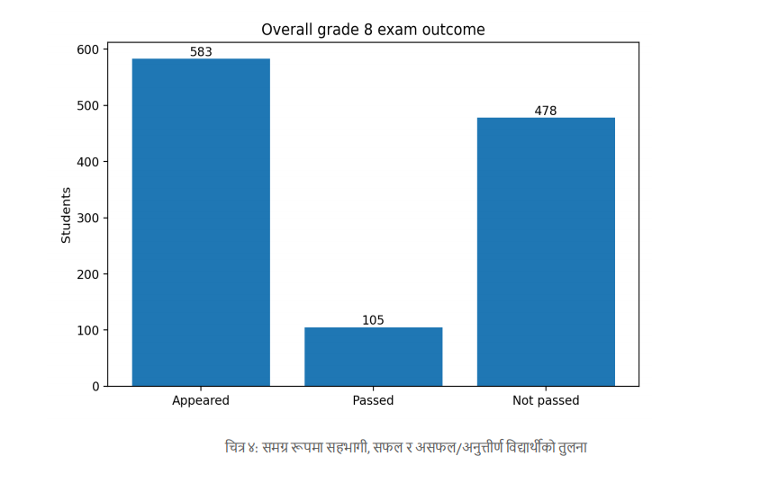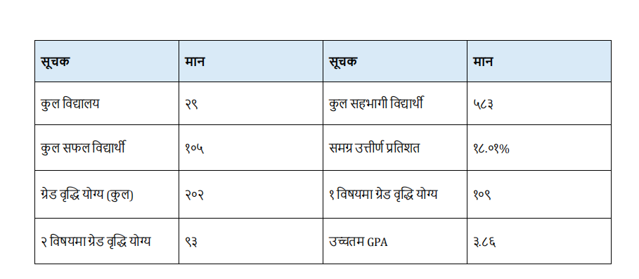 कुल ५८३ सहभागीमध्ये १०५ जना मात्र सफल भएका छन्। अर्थात् समग्र उत्तीर्ण प्रतिशत १८.०१ प्रतिशत मात्र रहेको छ। अर्को महत्त्वपूर्ण तथ्य के छ भने २०२ जना विद्यार्थी अझै ग्रेड वृद्धि (१ वा २ विषय) को सम्भावनाभित्र रहेका छन्, जसले आधारभूत सिकाइमा ठूलो अन्तर रहेको संकेत गर्छ।