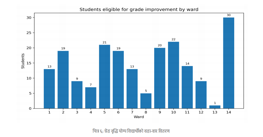 ग्रेड वृद्धि योग्य २०२ विद्यार्थी हुनु आफैंमा नीतिगत चेतावनी हो। यस समूहलाई लक्षित remedial classes, विषयगत सहयोग, अभिभावक सम्पर्क र अतिरिक्त अध्ययन कार्यक्रम सञ्चालन गरिएमा अल्पकालमै सुधार सम्भव देखिन्छ।