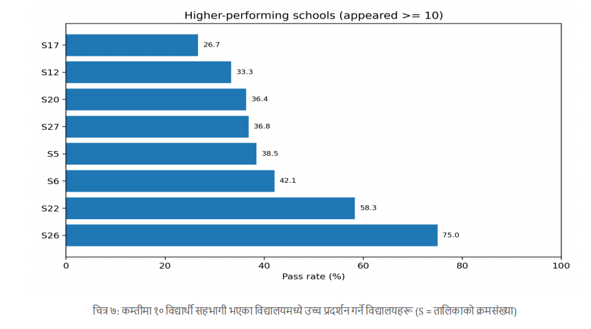 विद्यालय–विद्यालयबीच ठूलो असमानता देखिएको छ। केही विद्यालयले अपेक्षाकृत राम्रो नतिजा दिएका छन् भने धेरै विद्यालय शून्यदेखि १५ प्रतिशतको दायरामै सीमित छन्। यसले शिक्षक उपलब्धता, सिकाइ वातावरण, अभिभावकीय निगरानी, विद्यालय नेतृत्व र विद्यार्थी समर्थन कार्यक्रमबीच असमानता रहेको संकेत गर्छ।
