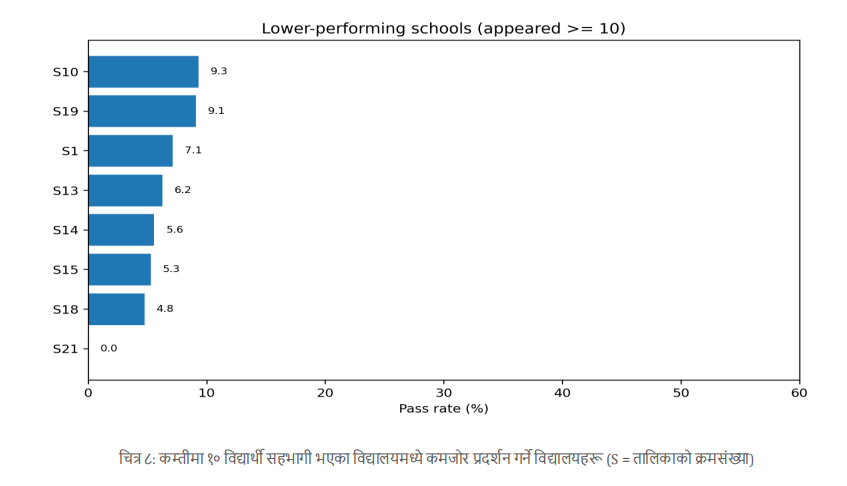 विद्यालय–विद्यालयबीच ठूलो असमानता देखिएको छ। केही विद्यालयले अपेक्षाकृत राम्रो नतिजा दिएका छन् भने धेरै विद्यालय शून्यदेखि १५ प्रतिशतको दायरामै सीमित छन्। यसले शिक्षक उपलब्धता, सिकाइ वातावरण, अभिभावकीय निगरानी, विद्यालय नेतृत्व र विद्यार्थी समर्थन कार्यक्रमबीच असमानता रहेको देखाउँछ।