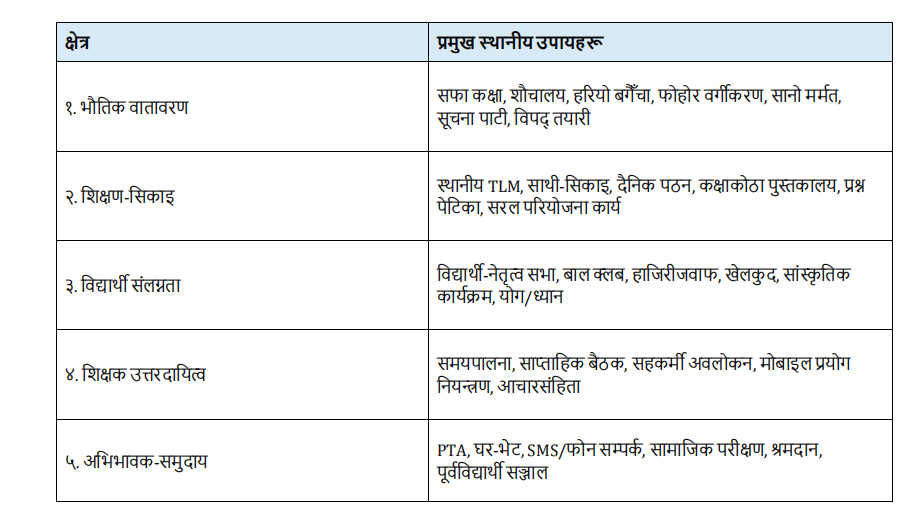 नीति–स्तरका ठूला सुधारसँगै स्थानीय तहबाट तुरुन्त सुरु गर्न सकिने साना तर प्रभावकारी कार्यक्रमहरू पनि उत्तिकै आवश्यक छन्। तलका पाँच क्षेत्रमा केन्द्रित सुधारले विद्यालयको वातावरण, सिकाइ, अनुशासन र समुदायको भरोसा क्रमशः बलियो बनाउन सक्छ।