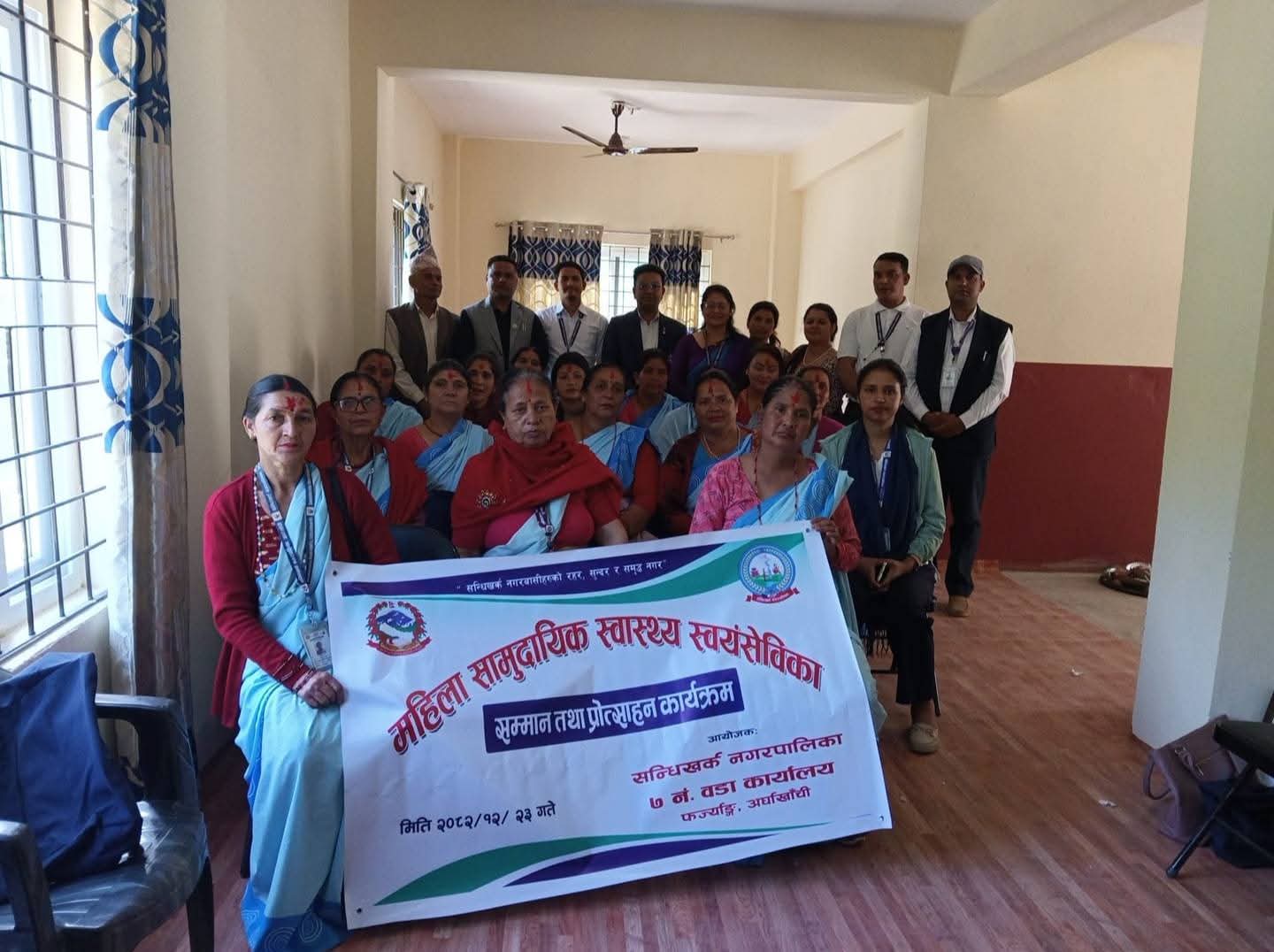 सन्धिखर्क — सन्धिखर्क नगरपालिका वडा नं. ७ ले महिला सामुदायिक स्वास्थ्य स्वयंसेविका सम्मान तथा प्रोत्साहन कार्यक्रम सम्पन्न गरेको छ।