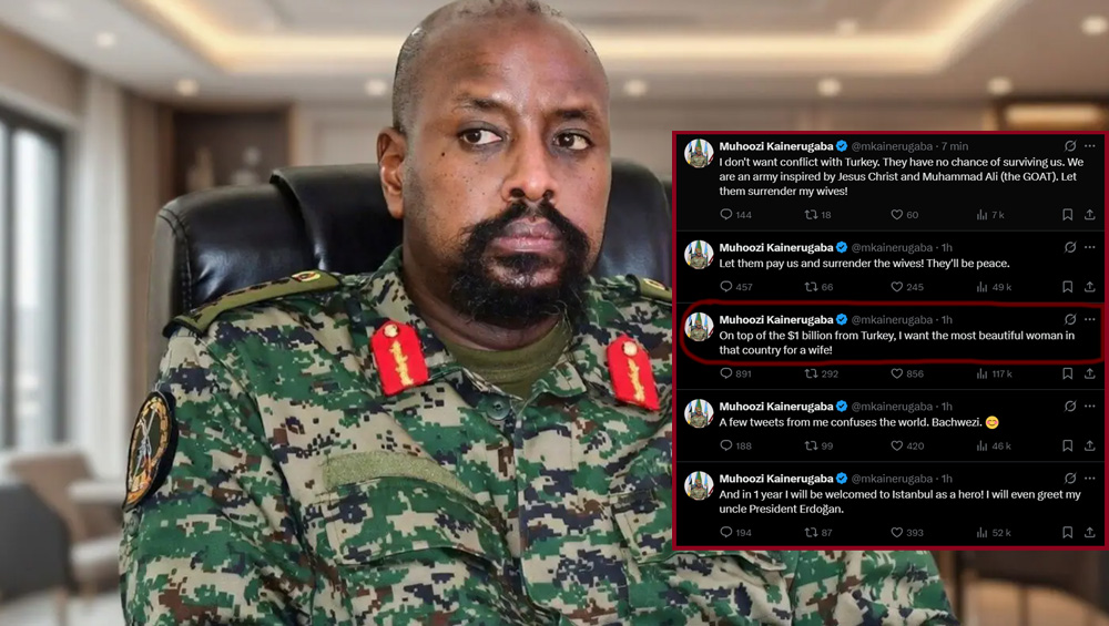काठमाडौँ । युगान्डाका सेनाप्रमुख तथा राष्ट्रपतिका छोरा मुहोजी कानेरुगाबाले टर्कीसँग सम्बन्धित विवादास्पद अभिव्यक्ति दिएपछि अन्तर्राष्ट्रिय स्तरमा चर्चा चुलिएको छ । उनले टर्कीबाट एक अर्ब डलर बराबर रकम र ‘देशकै सबैभन्दा सुन्दर महिला’लाई पत्नी बनाउने माग सार्वजनिक रूपमा गरेका छन् ।